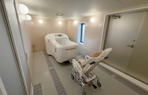 搬入しやすさに配慮して壁にドアを設けた機械浴室の改修事例