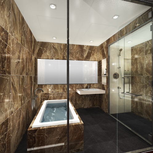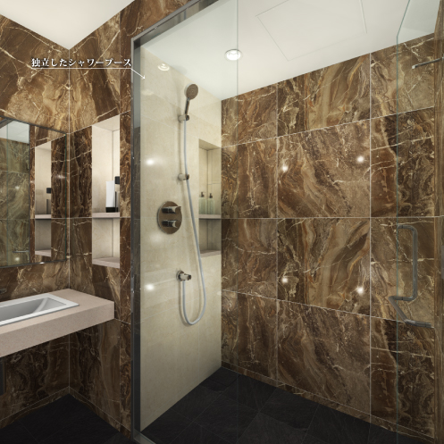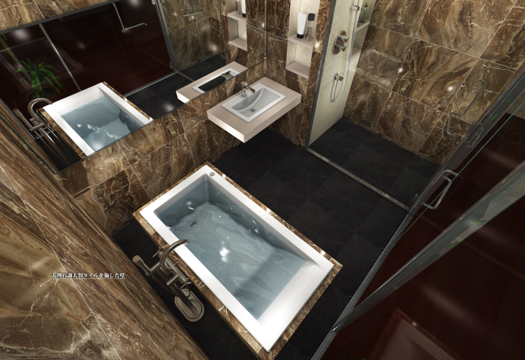 重厚感たっぷりの大理石調大判タイルが印象的な空間。
