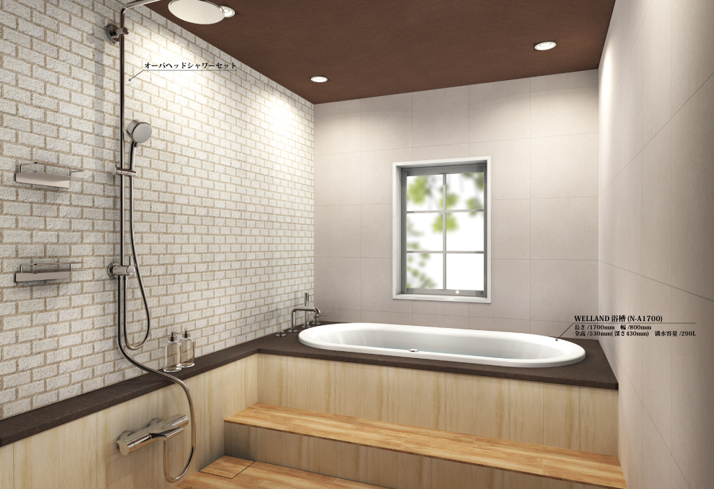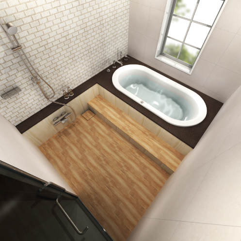 | 浴槽デッキ側面・洗い場カウンター側面・ステップ側面 | 150×600角タイル(SY-H3010)貼 |