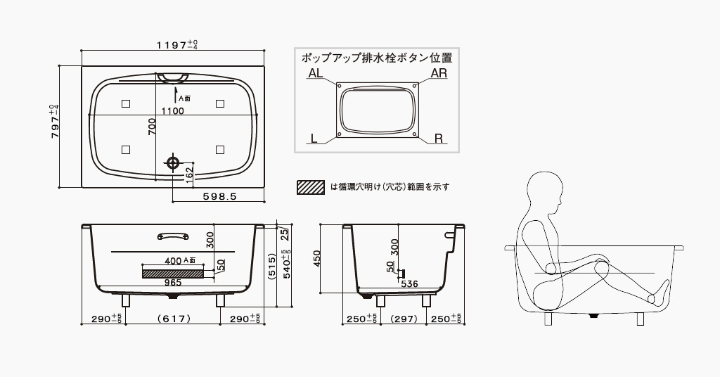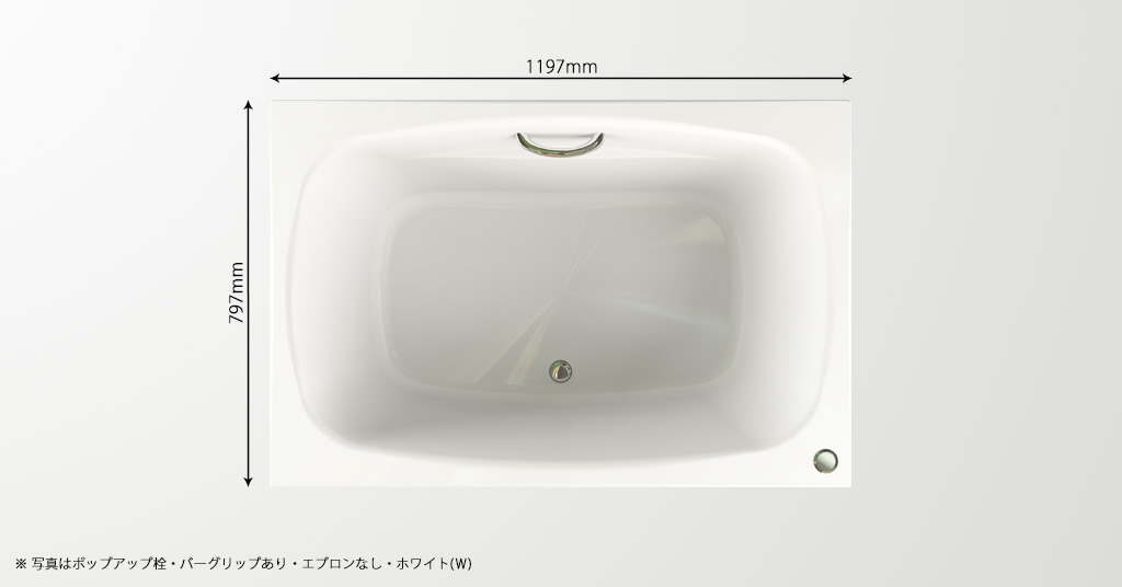 浴槽サイズ : 1197mm×797mm×540mm 価格【ゴム栓/バーグリップなし】:165,000円〜(税別)
