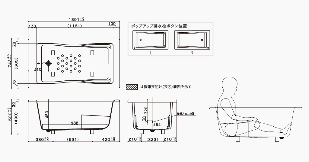 浴槽サイズ : 1391mm×743mm×520mm 価格【ゴム栓/バーグリップなし】:235,000円〜(税別)