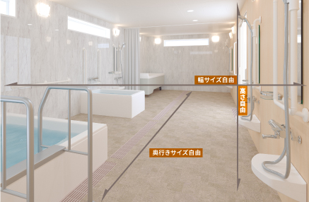 リフォームの場合も既存スペースを最大限に活用し、広さや使いやすさに合わせて1cm 単位から自由にレイアウトできます。高齢者施設など、複数人で利用する大型サイズにも対応可能です。
