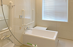 下半身が不自由な方でも一人で入浴できる自立支援タイプの浴室です。浴室内の床の高さを変えることで、車椅子から洗い場へ移乗がしやすいよう設計しています。また、浴槽またぎ高さを低くすることで、浴槽に出入りしやすくなっています。 ... 続きを読む