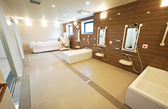 浴槽1台と、機械浴槽2台を設置した超大型ユニット!カーテンで仕切ることで多人数入浴時のプライバシーも確保
