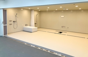 3次防水まで施した完全防水の大型ユニット!5,500mm×5,800mmサイズで機械浴槽に対応!