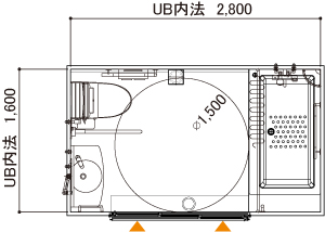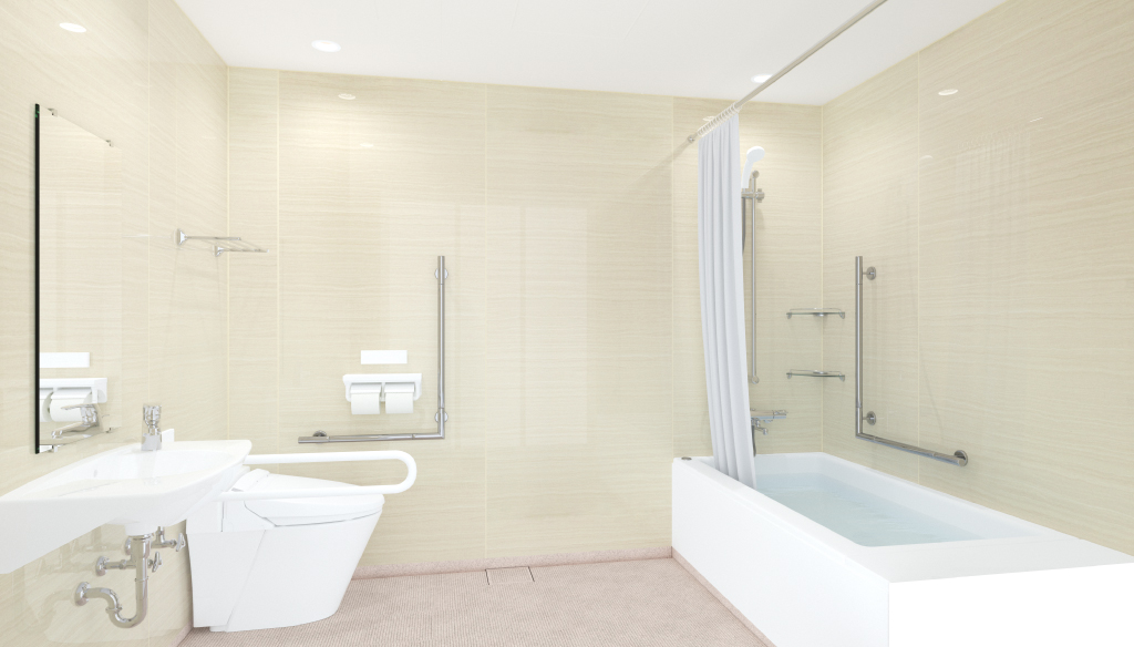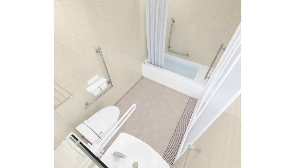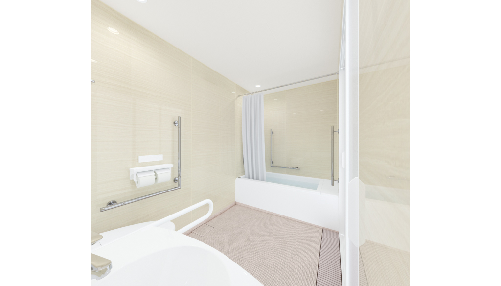 - このプランは足元のみ車椅子の回転スペースφ1,500を確保しています。足元以外も回転スペースを確保する場合は間口方向に50mm程浴室を広げる必要があります。(2,850mm以上必要)
