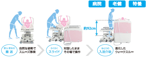 寝たまま入浴に必要な様々な機能を備えています。入浴者は足を伸ばして、ゆったり入浴でき、介助者は自然な姿勢のままで担架から浴槽への移乗が行え、その場で全身のケアと入浴操作が行えます。