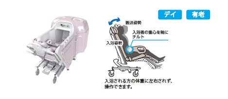 身長180cmの方でも快適な姿勢で入浴できるひろびろ浴槽。搬送車は独自のバランスチルトにより、介護労力を大幅に軽減しました。