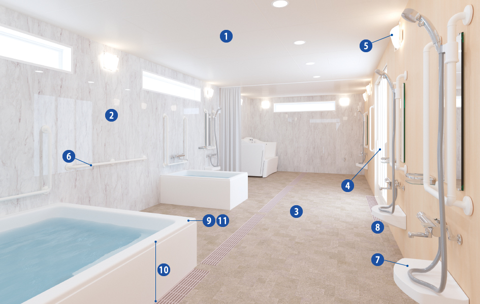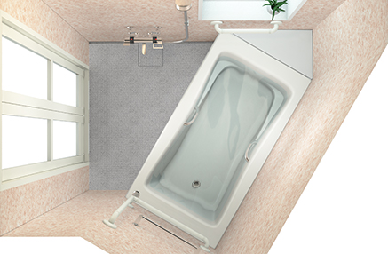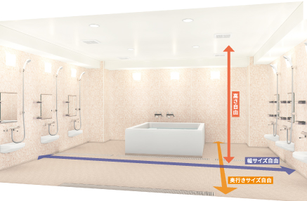 壁や床などの仕上げ材や浴槽、器具などは自由にお選び頂けます。また、浴槽のまたぎ高さや浴槽のレイアウトも自由に設定できるので、利用用途に沿ったシステムバスをご提案することができます。
