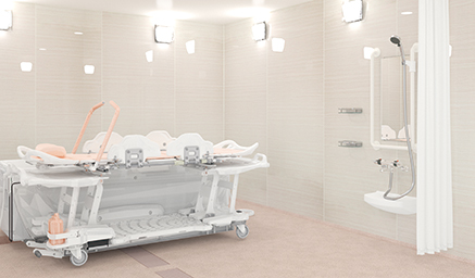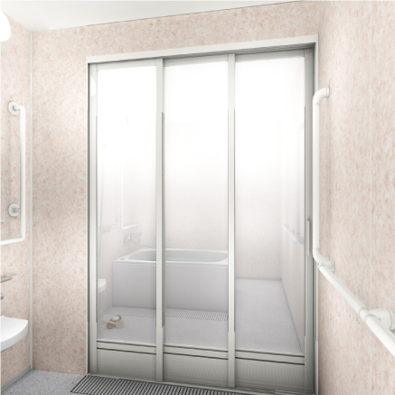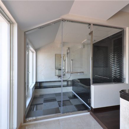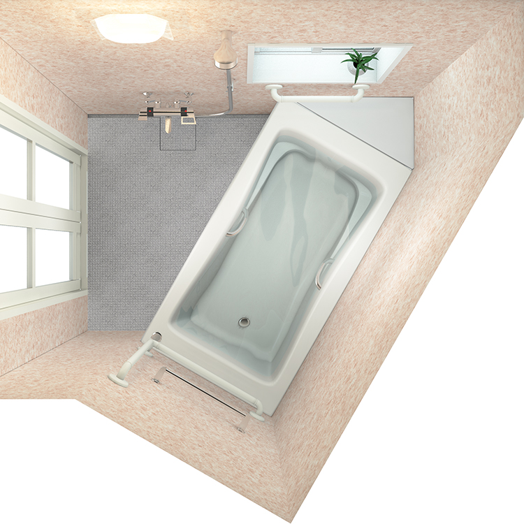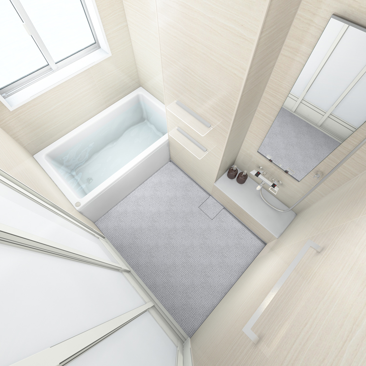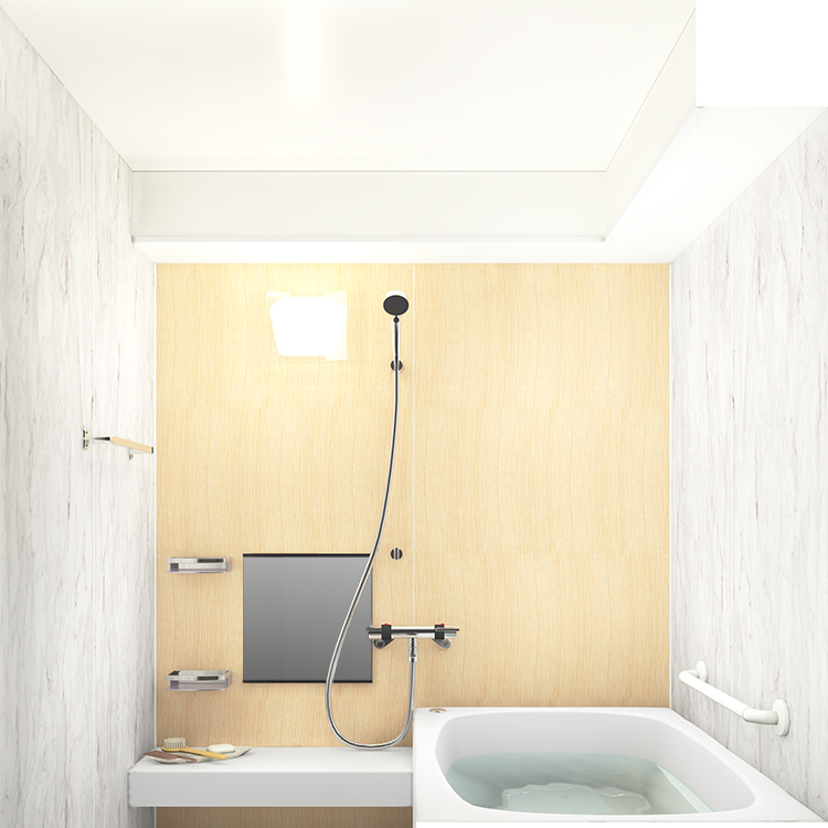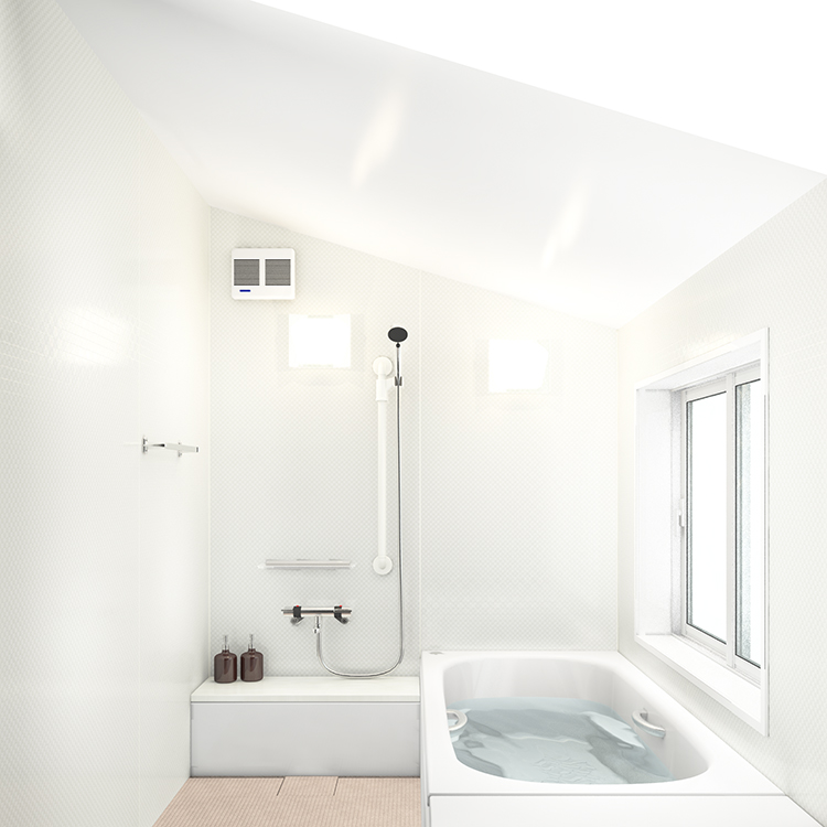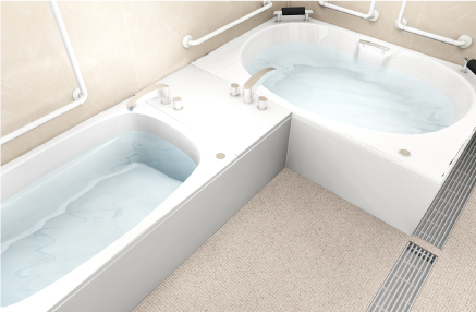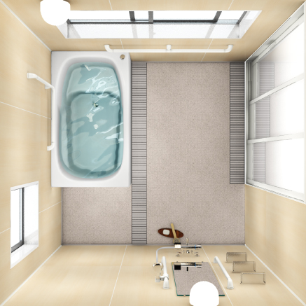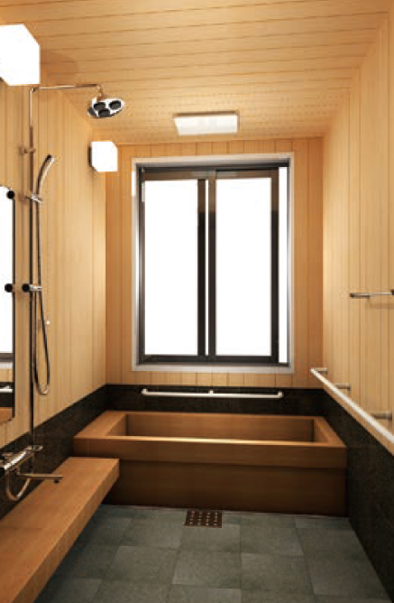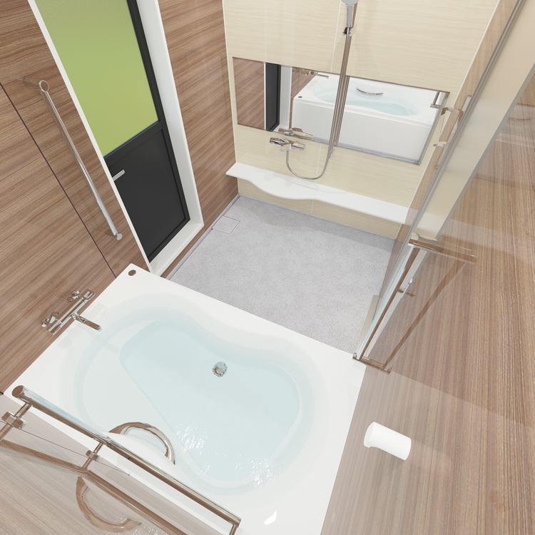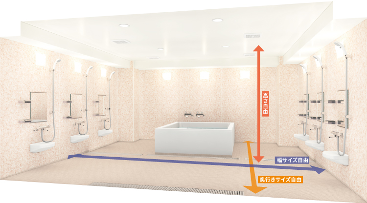 壁や床などの仕上げ材や浴槽、器具などは自由にお選び頂けます。また、浴槽のまたぎ高さや浴槽のレイアウトも自由に設定できるので、利用用途に沿ったシステムバスをご提案することができます。
