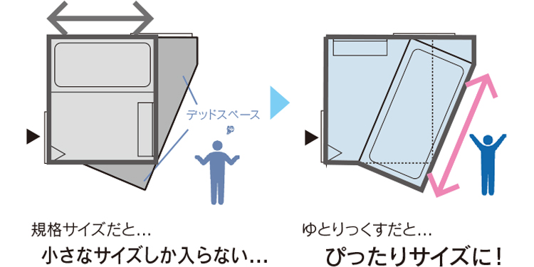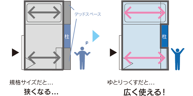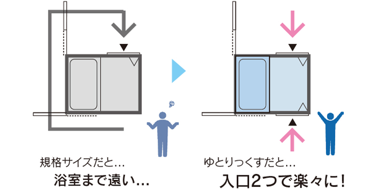 サイズは1cmきざみで対応ができます。大型浴槽の設置や車椅子で移動するスペースまで確保した大きなユニットから、狭いスペースに合わせた小さなユニットまで、自由に設計可能です。