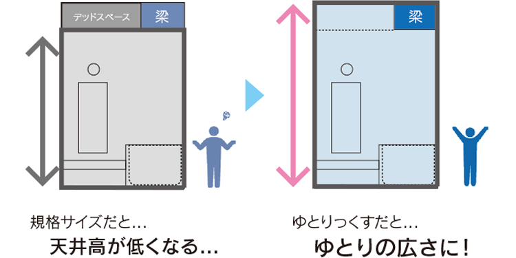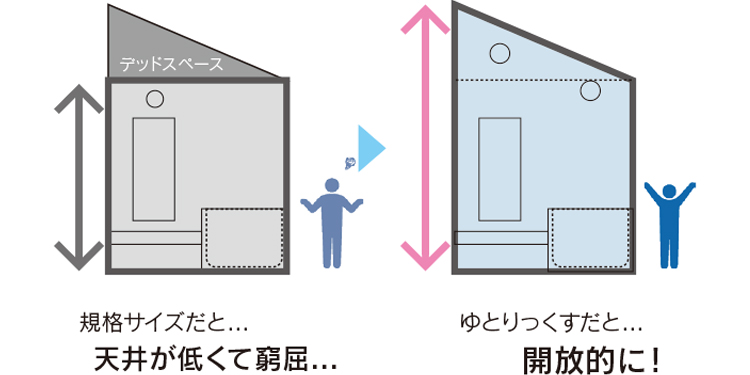 どんな形でも対応できます。柱や梁の影響で通常のシステムバスでは小さなサイズしか入らない場合にも柱・梁部分だけを避けた壁・天井形状にできるので、スペースを最大限に活用できます。