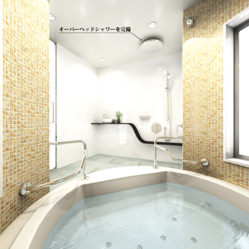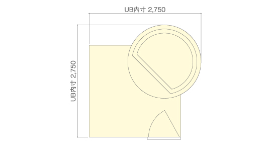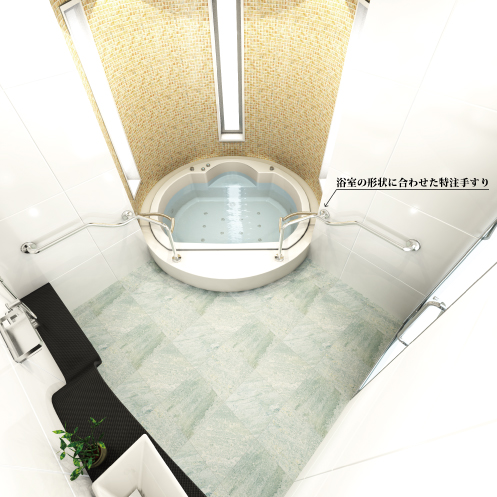 すると「円形浴槽にシンクロするようにカーブを描くタイル壁」という、