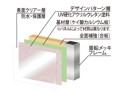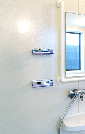 全面補強なので手すりなど器具を自由に増やせます。表面に傷や汚れが付きにくいのも特長です。 パネルはオプションでハイグレードパネルに変更できます。