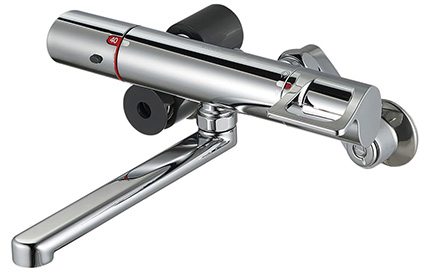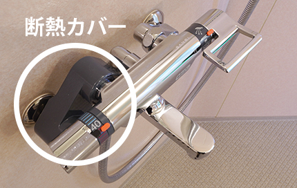高級感漂うメッキシャワーヘッドを搭載したサーモシャワー混合水栓。シャワーヘッド部のボタン操作で水の出し止めが可能で、こまめな止水が節水に効果的です。さらに、やけどを防止する断熱カバーも付いています。