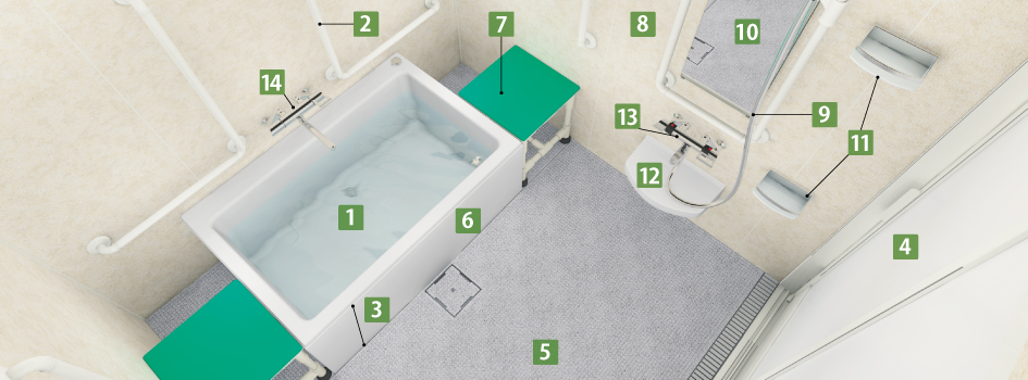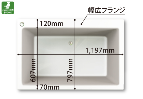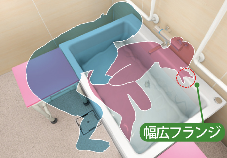 幅広フランジが特長です。標準プランは幅広フランジを壁側に設置します。これにより手すりや壁付浴槽水栓(オプション)などの出っ張りを避けることができます。またフランジが広い分、入浴の際に手をつきやすく身体を安定させる働きもあります。