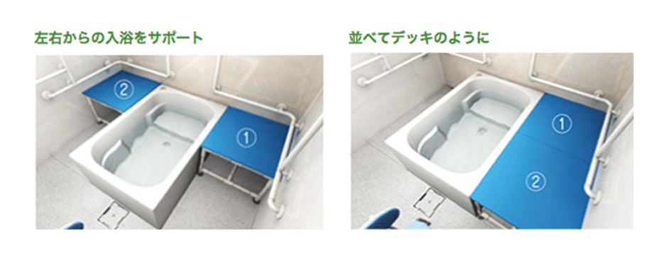 浴槽縦置タイプ(B型)は約600角サイズの移乗台が2ヶ標準装備されています。移乗台を隣同士に並べれば浴槽と同じ長さになり、大型腰掛デッキのように使うこともできます。