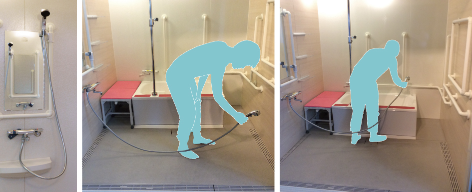 浴槽側のL型手すりは浴槽の出入りや入浴中の姿勢保持のサポートをします。入口付近のL型手すりは水平方向の手すりで歩行の補助、垂直方向の手すりでドア開閉時の姿勢保持の補助となります。