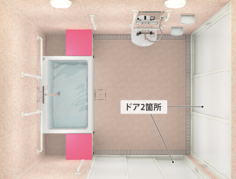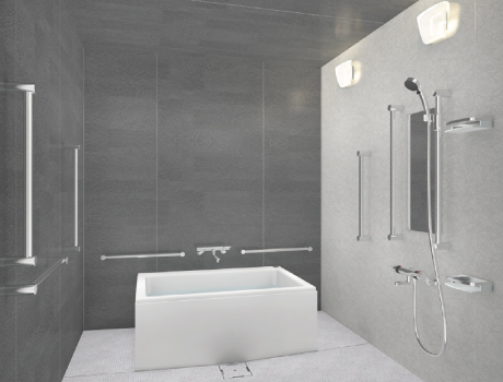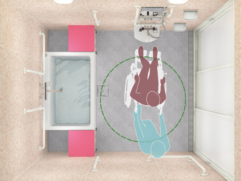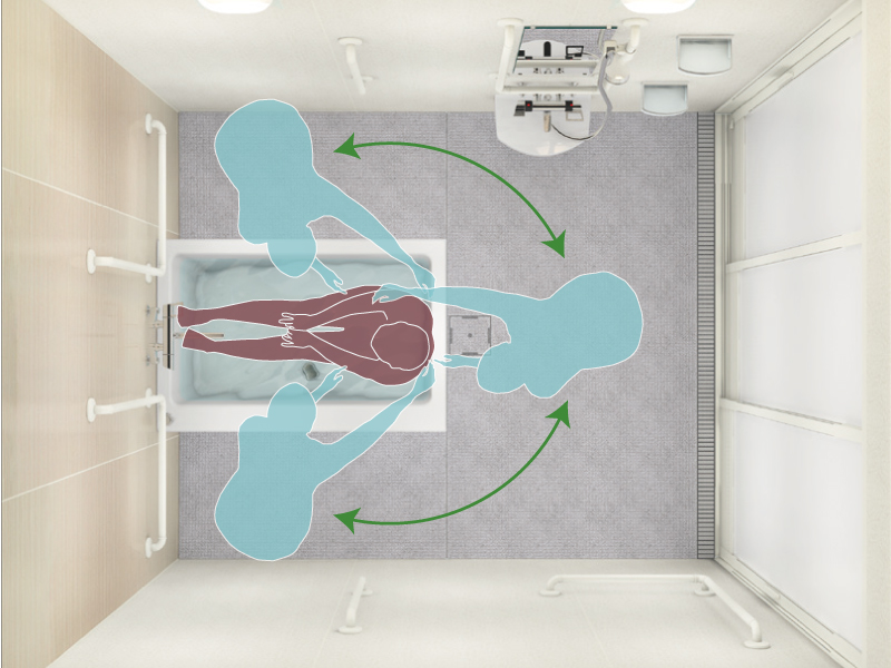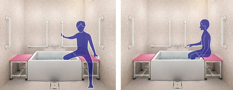 浴槽側のL型手すりは浴槽の出入りや入浴中の姿勢保持のサポートをします。入口付近のL型手すりは水平方向の手すりで歩行の補助、垂直方向の手すりでドア開閉時の姿勢保持の補助となります。