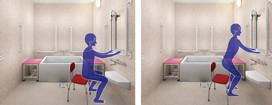 Ⅰ型手すり(垂直方向)は立ち上がりの補助として利用します。たとえば移乗台に腰かけている際にI型手すりを用いて立ち上がることができます。
