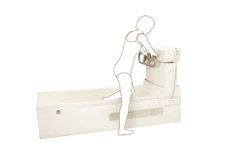 リフト付きシャワーキャリーの設置に対応しています。エプロンには補強が入っているので、浴槽フランジ挟み込み式の手すりの設置が可能です。