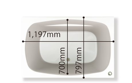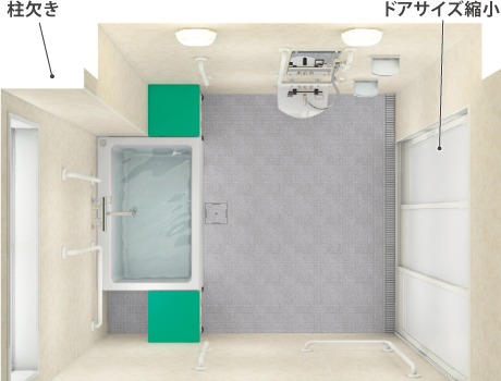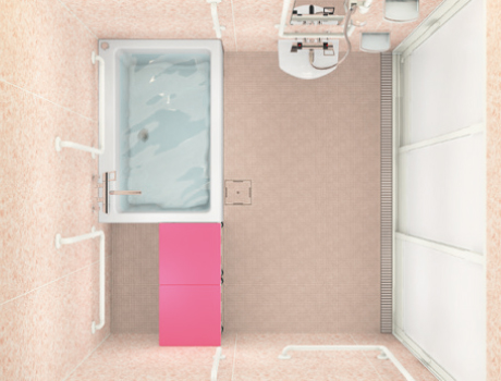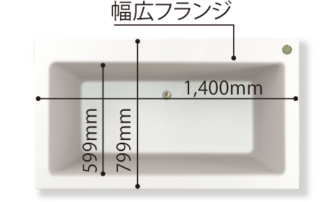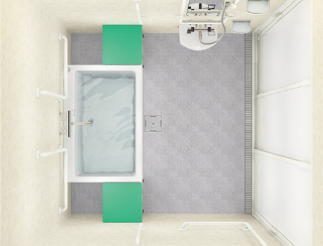 幅広フランジが特長です。標準プランは幅広フランジを壁側に設置します。これにより手すりや壁付浴槽水栓(オプション)などの出っ張りを避けることができます。またフランジが広い分、入浴の際に手をつきやすく身体を安定させる働きもあります。