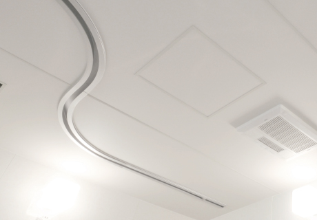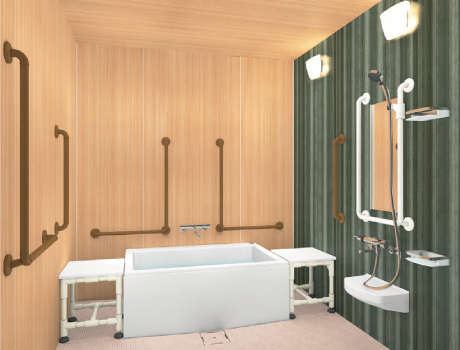 浴槽への出入りや、浴槽内での立ち座りをサポートする手すりです。I,L,U型の組み合わせにて承ります。移乗台に腰かけた状態から浴槽に入るまでをスムーズにし、浴槽内での滑りを防止する役割も果たします。さらに、湯船につかった場合には入浴姿勢を安定させることもできます。手すりが連続している分、サポートできる範囲が広く安心です。