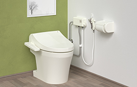 高齢者の方だけでなく、誰にでも使いやすいようにオート機能の付いた全自動トイレです。オート機能のついたトイレでは洗浄を自動的に行います。更に、フルオート機能のついたトイレでは、人感知センサーにより便座のフタの開閉も行います。人が触れる部分も最小限となり、より清潔にお使いいただけます。