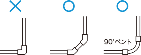 排水配管VP25(VP20)の曲りには90°エルボは使用できません。45°エルボを2個使用して曲げてください。