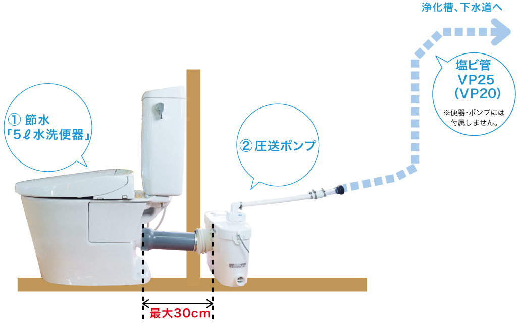 ※圧送ポンプは簡易水洗トイレと接続して使用することはできません。