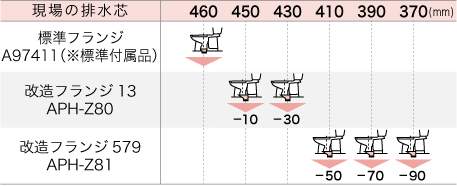 - ※改造フランジを使用した場合、本水洗へ切替えを行う際には配管位置変更の工事が必要になります。