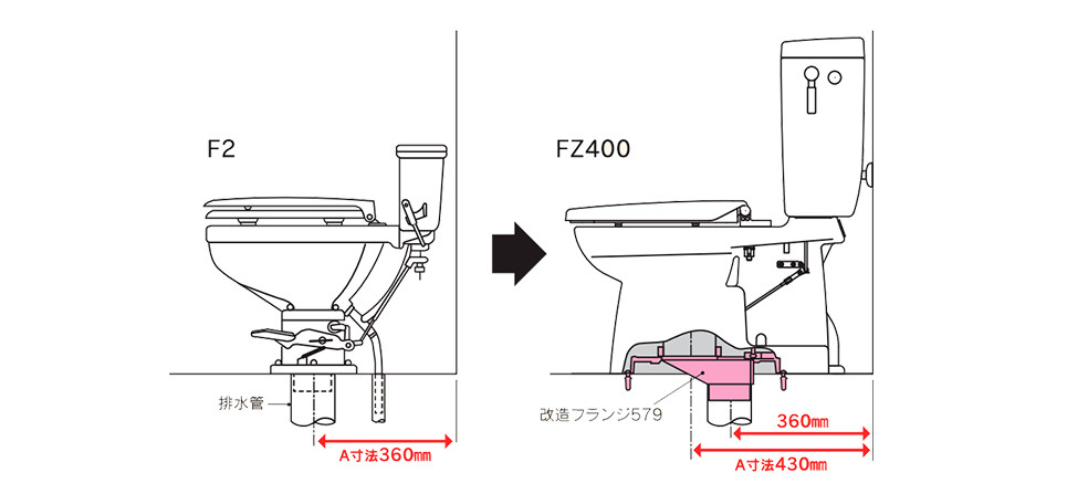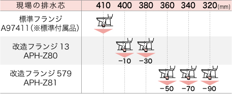 ※改造フランジを使用した場合、本水洗へ切替えを行う際には配管位置変更の工事が必要になります。