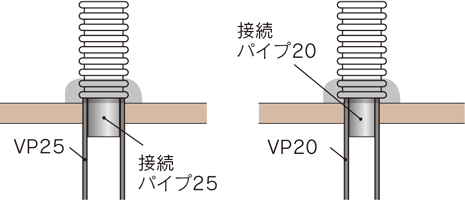 既設のオーバーフロー屋外配水管がVP25やVP20のときでも接続可能な接続パイプを付属しています。