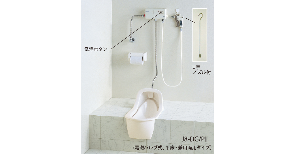 J8-DGは電磁バルブ式、J8-CFGはフラッシュバルブ式で、水を貯めるタンクがないため、狭い場所にも設置できる和式の簡易水洗トイレです。この機種はどちらも「バランス式開閉弁タイプ」になります。