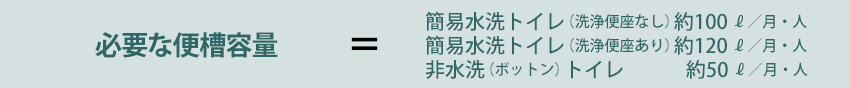 - ※上記式での容量算定は1ヶ月に1度の汲取りを原則としています。積雪地帯など、汲取り回数が少なくなる地域では大きめの便槽をお選びください。