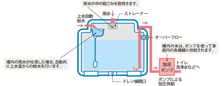 地震や火災など、もしもの時に使える水を確保する貯水タンクとして機能します。