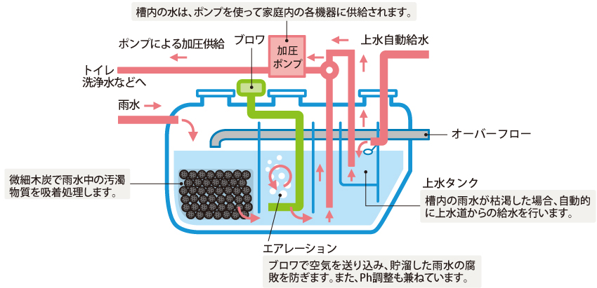 雨水の収集から浄化、浄化した水の供給、雨水が不足した場合の上水道からの給水まで、すべてを自動で行います。