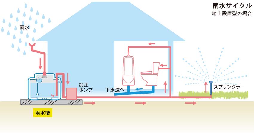 - A.補助金の有無や再利用水の用途にご注意ください。補助金の有無は自治体により異なりますので、事前に管轄の自治体へご確認ください。また、再利用する雨水は散水・洗車・トイレの洗浄にのみ使用できます。飲料水や温水洗浄便座、洗濯など、肌に直接触れる用途には使用できません。