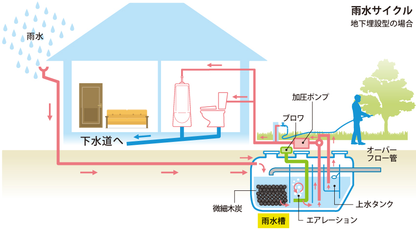 雨水を屋根から雨樋を通して収集し、浄化した後タンクへ貯水して、散水・洗車・トイレの洗浄に再利用するシステムです。限りある水資源を有効活用できます。