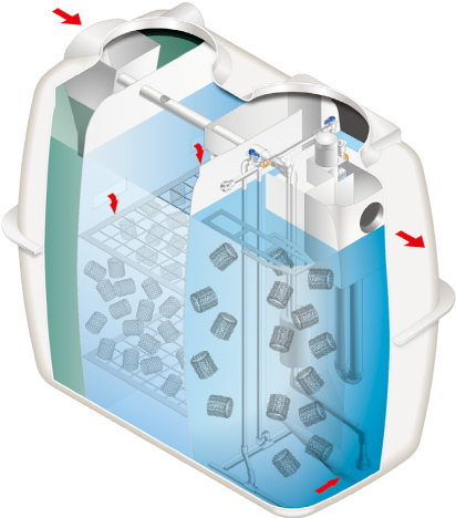 維持管理性においても定評のある“横向流夾雑物除去方式”をアレンジした構造です。ポリプロピレン(PP)外槽※で、本体重量を軽量化しています。ブロワにも省エネ仕様を採用し、環境に配慮しました。