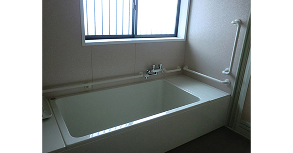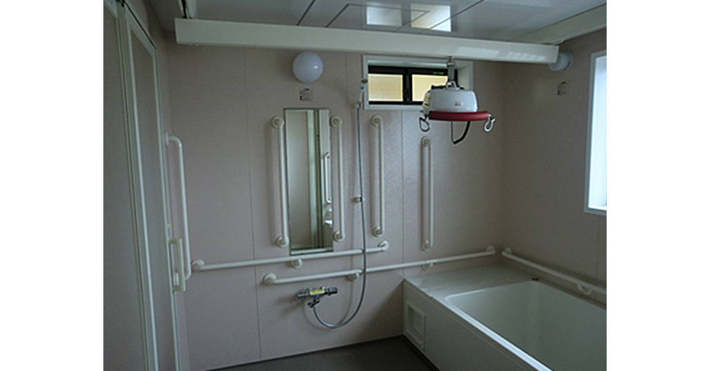後方にリフトを設置するための浴槽です 介護施設で介護用のリフトを設置して使用するため、後方に余裕を持たせたつくりの浴槽にしました。また、浴槽内の深さも深くし、リフト設置をしやすいように考慮しています。