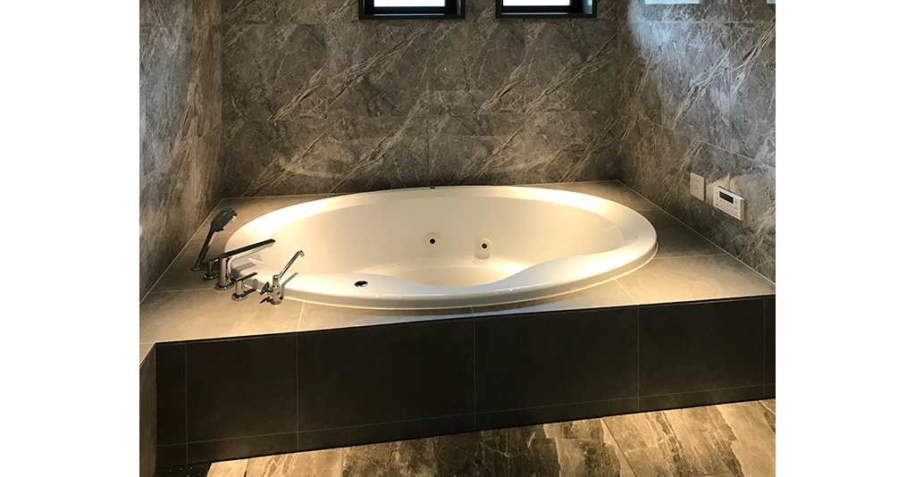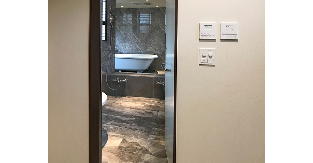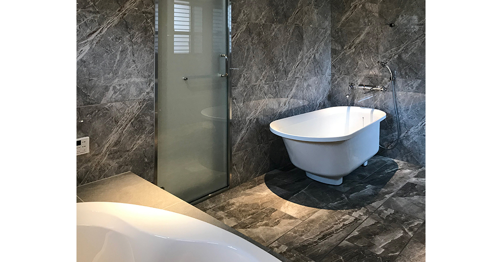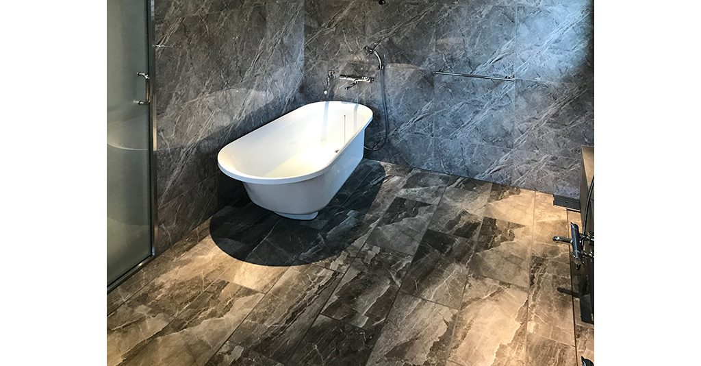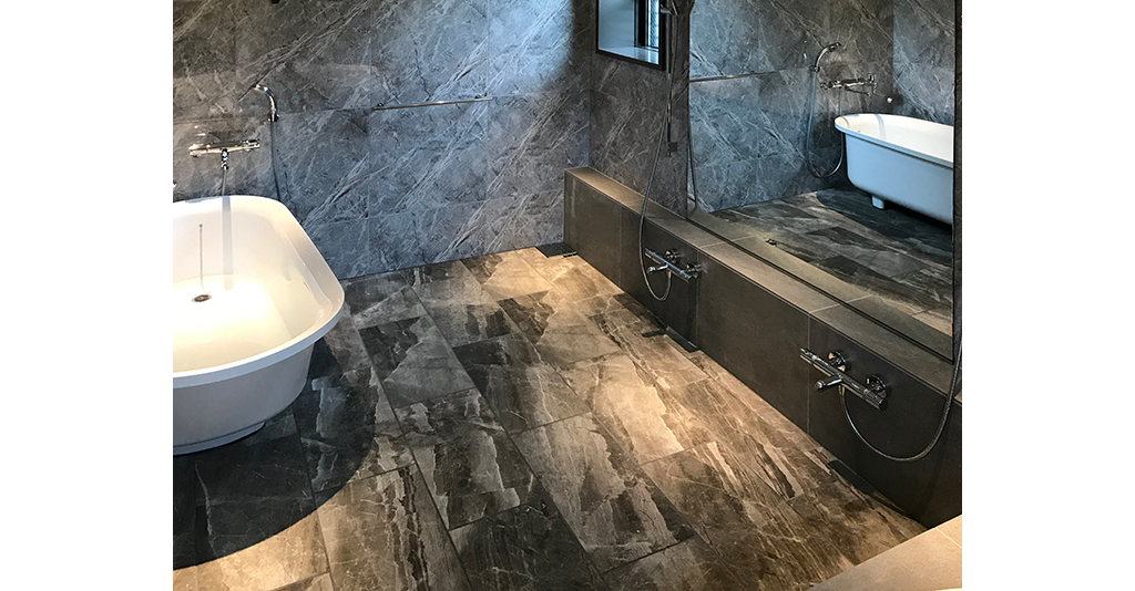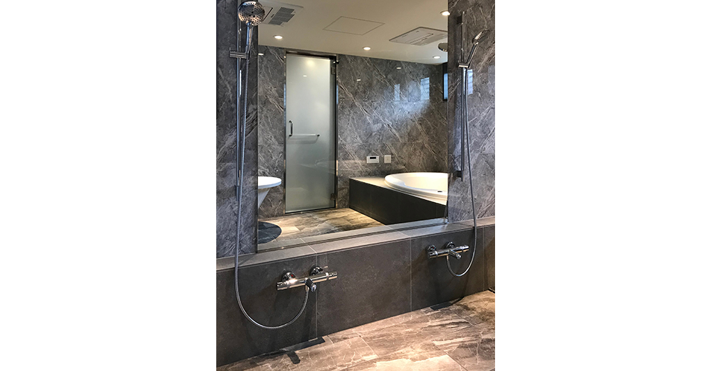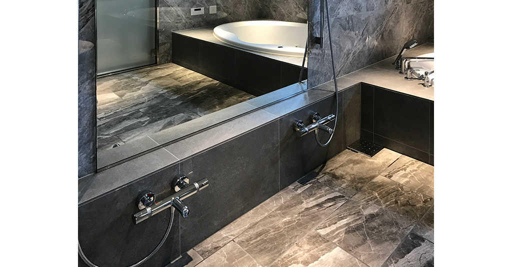 壁は大判の大理石調タイル、床、浴槽エプロンにも石目調のタイルをつかい、重厚感のある空間に仕上げました。さらに、壁面に大型のミラーを設置している為、奥行のある空間に仕上がっています。