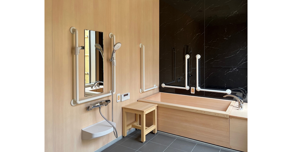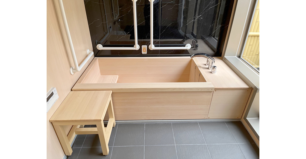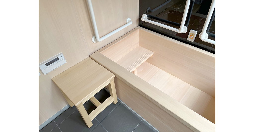 浴槽は1400サイズの木曽檜製の木風呂。カウンターや、移乗台もヒノキで統一されている為、まるで高級旅館のバスルームを感じさせる作りとなっています。