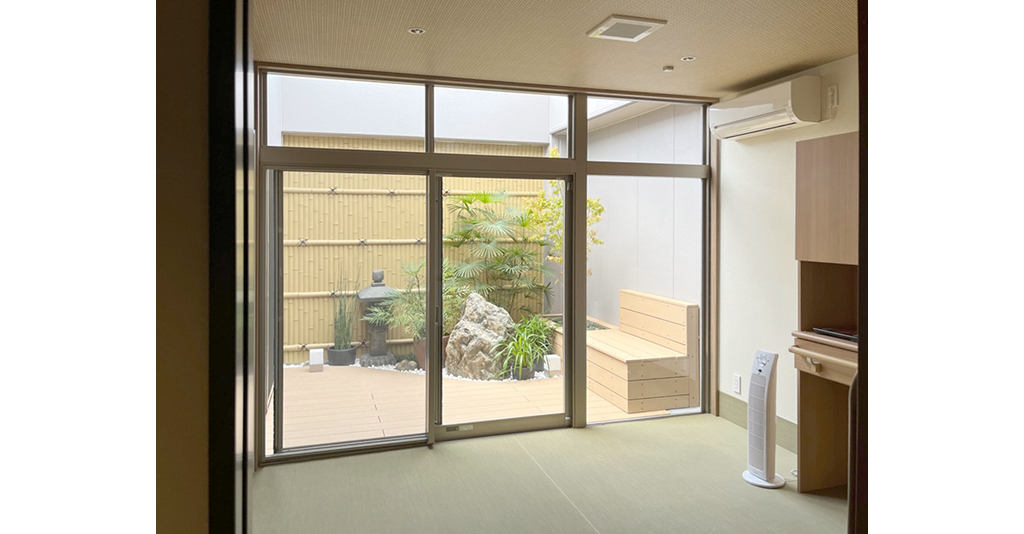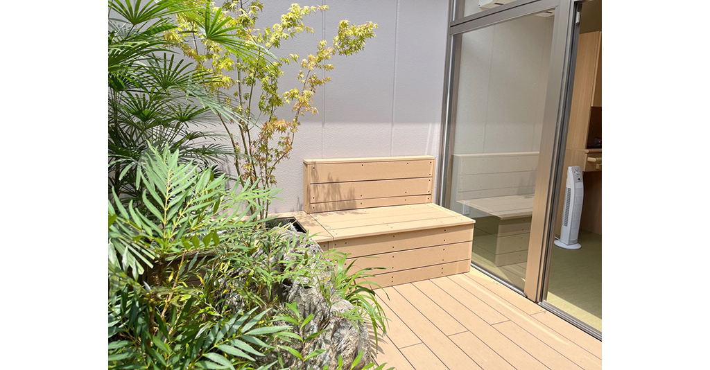 壁一面が窓になっており外にも出入りできるので、露天風呂の雰囲気を愉しめます。