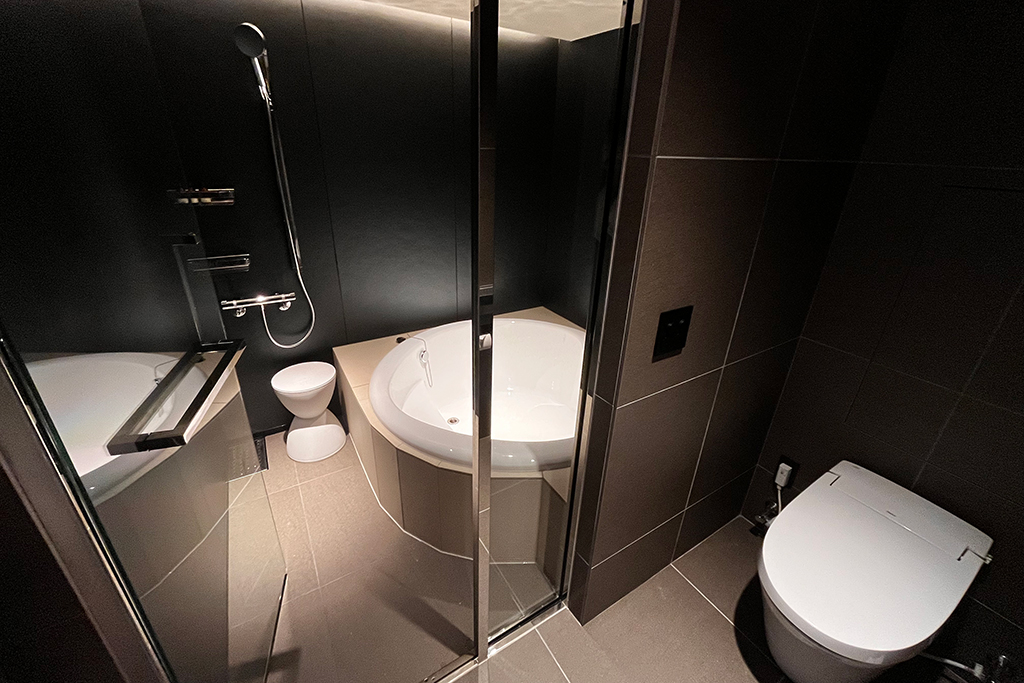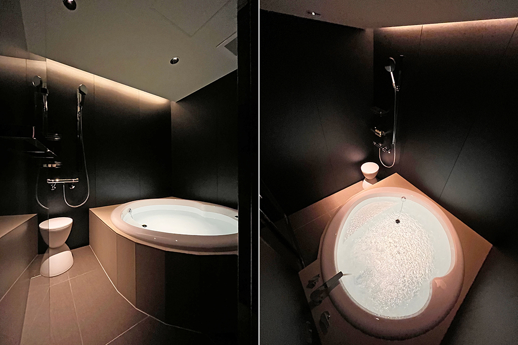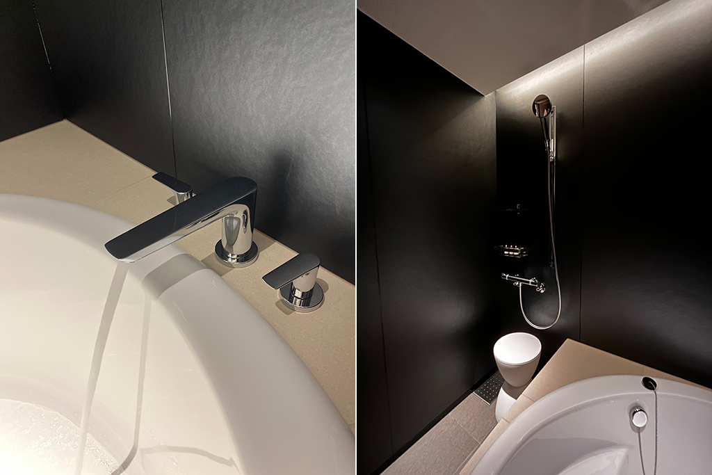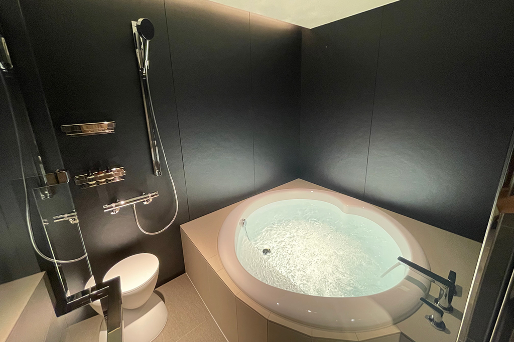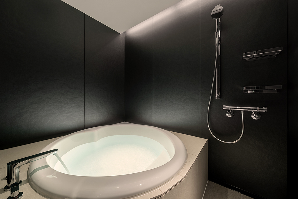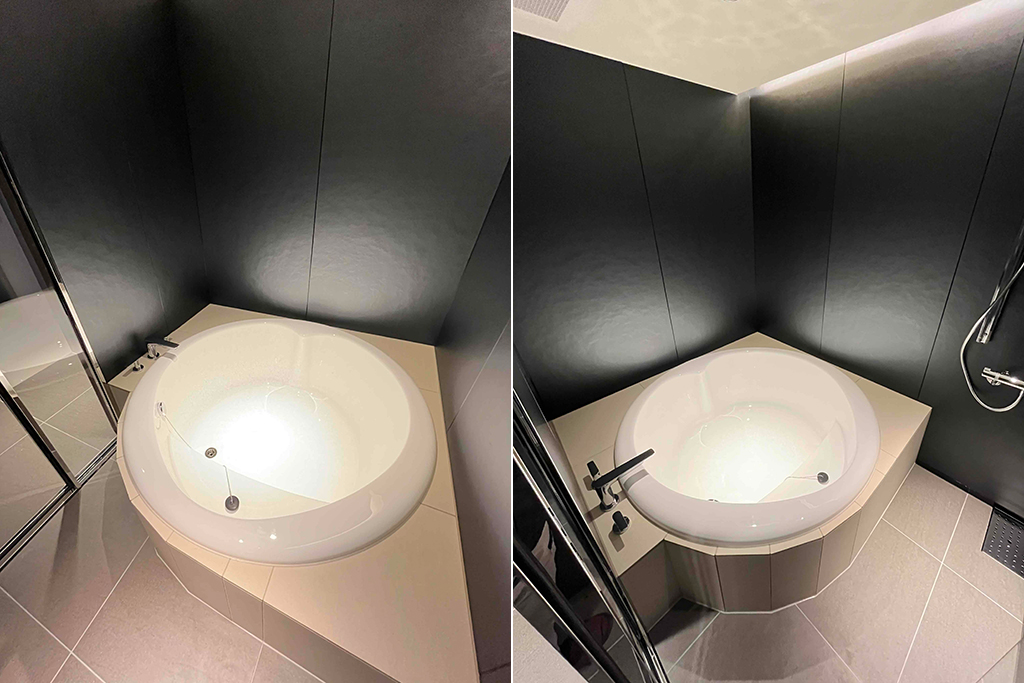 ワンランク上のスタイリッシュなバスルーム( part2) ラグジュアリーな円形浴槽で極上のバスタイムを愉しむ 歴史ある福岡のホテルがリデザインされ、バスルームが一新されました。 浴槽は高級バスタブメーカーWellandの円形浴槽。水栓はドイツの老舗メーカーhansgroheで統一。 壁は黒のハイグレードパネル、床とエプロン周りを淡色タイルにする事で、高級感あるモダンな空間に仕上がりました。 天井面は折上天井に間接照明を組み合わせることによって、柔らかい光に包まれた極上のバスタイムを演出いたします。 システムバス内寸:1,580mm×2,080mm×高さ2,100mm 出荷先 福岡県内のホテル 「ホテル イル・パラッツォ」ゲストルーム 設計価格 別途お問い合わせください (現場状況により設計価格は異なります) 主な仕様 浴槽:円形浴槽(Welland Roco1400) 水栓:バス水栓、シャワー水栓一式(hansgrohe) ドア:片開きテンパドア(SUS,強化ガラス) 壁:ハイグレードパネル(ムーンシャドウ) 床・デッキカウンター・エプロン:タイル貼り 天井:折上天井(間接照明)