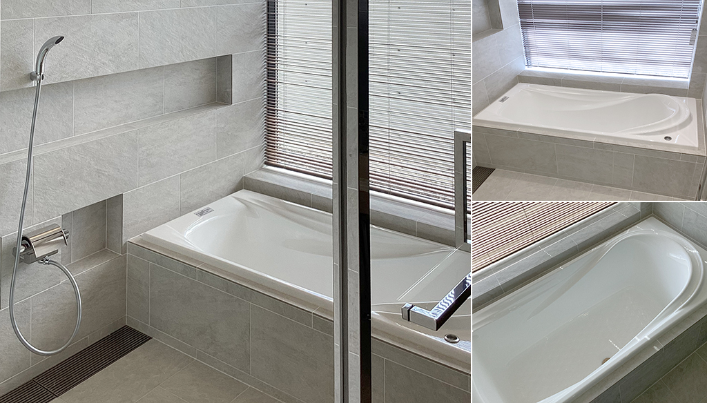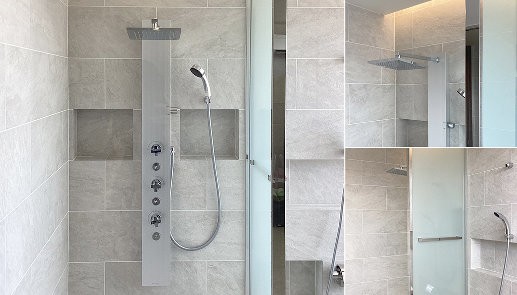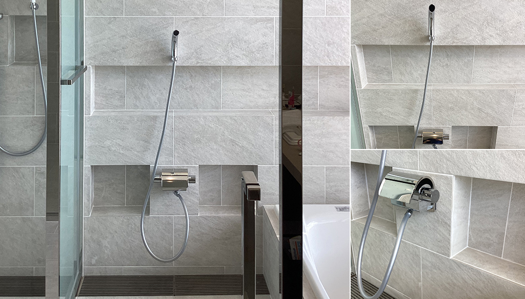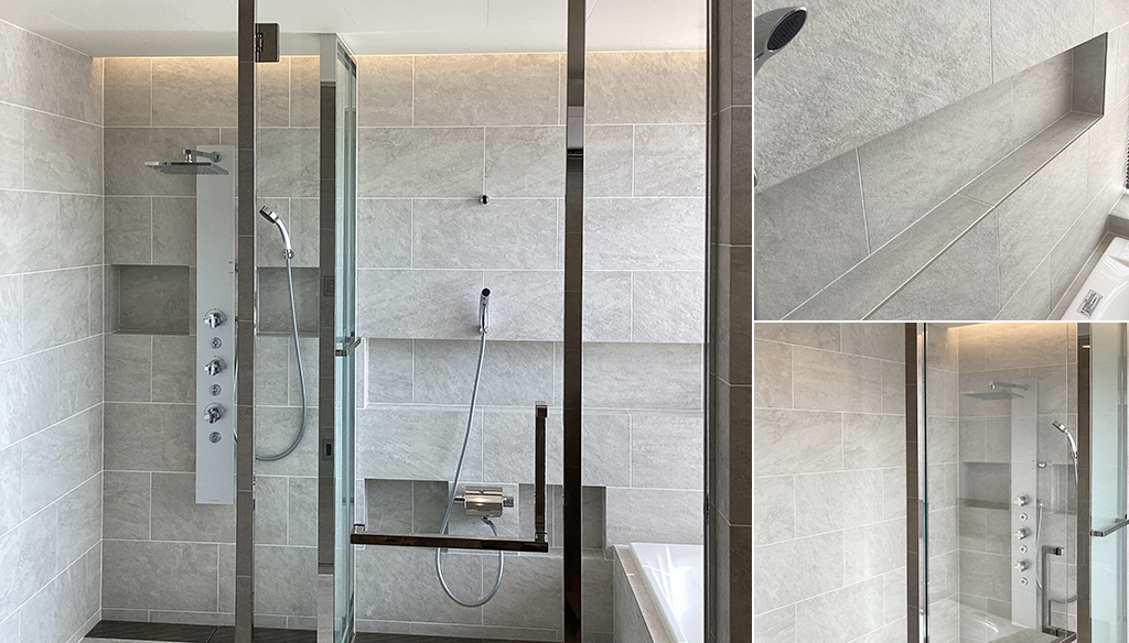 壁は石目調の美しいタイル貼りでニッチ棚が加工されており、実用的でありながらもスタイリッシュさを感じさせます。