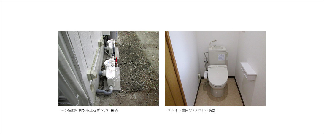 屋外にある昔ながらのポットン便所を使用していました。事務所の改修工事を行うにあたり、事務員や来客者が気持ちよく使えるように事務所内にトイレを設置しました。 排出は、容量2000Lの便槽に溜めて汲み取ります。使用者は男性が多いため、小便器GTを設置することで便槽容量を小さくすることができました。 小便器を設置しないと2500リットル以上の便槽必要容量が、小便器を設置すると1800リットル以上の便槽必要容量となり、2000リットルの便槽を選定しました。