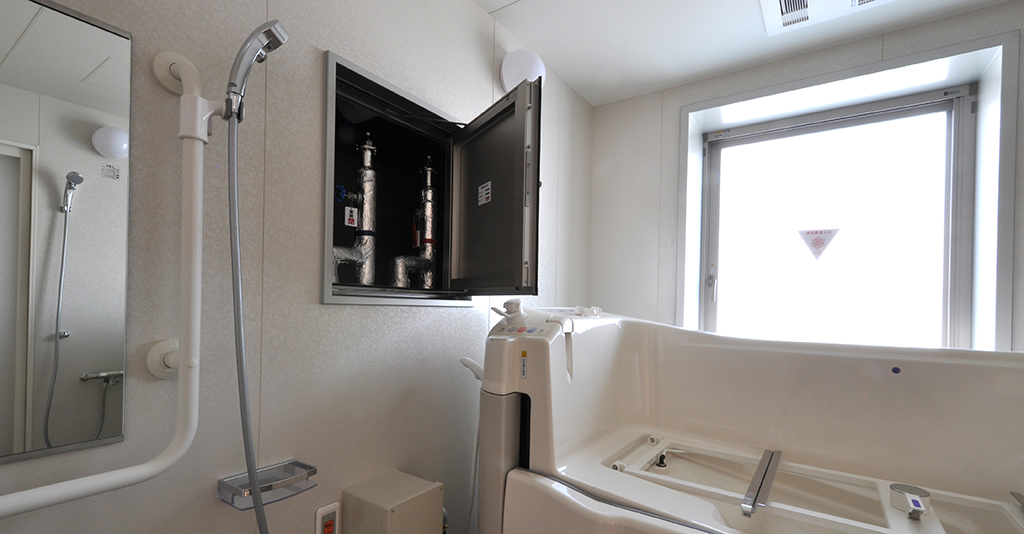 車椅子動線に配慮した横置浴槽型ユニット車椅子利用者の動線に配慮した横置浴槽型システムバスです。 FRP浴槽を横置きに配置し、スペースを有効活用しながら車椅子でのスムーズな入浴をサポートします。 移乗台は柱欠スペースにピタ ... 続きを読む
