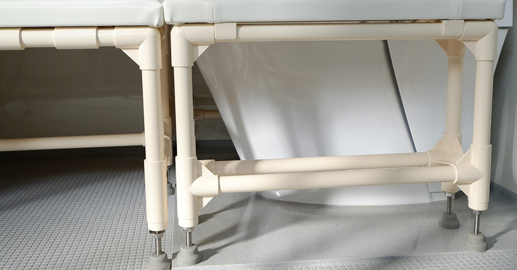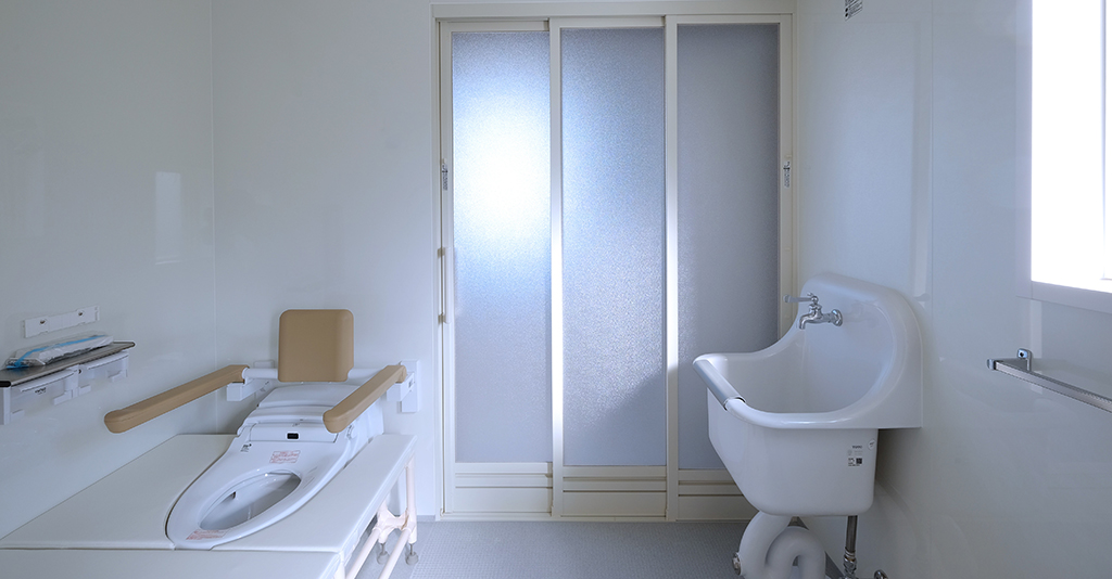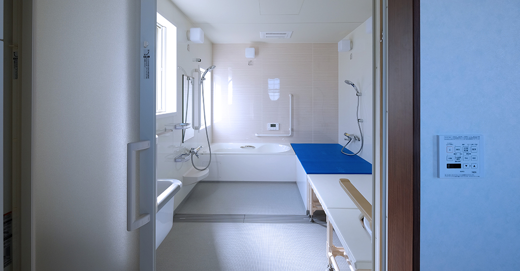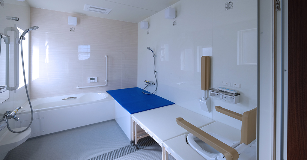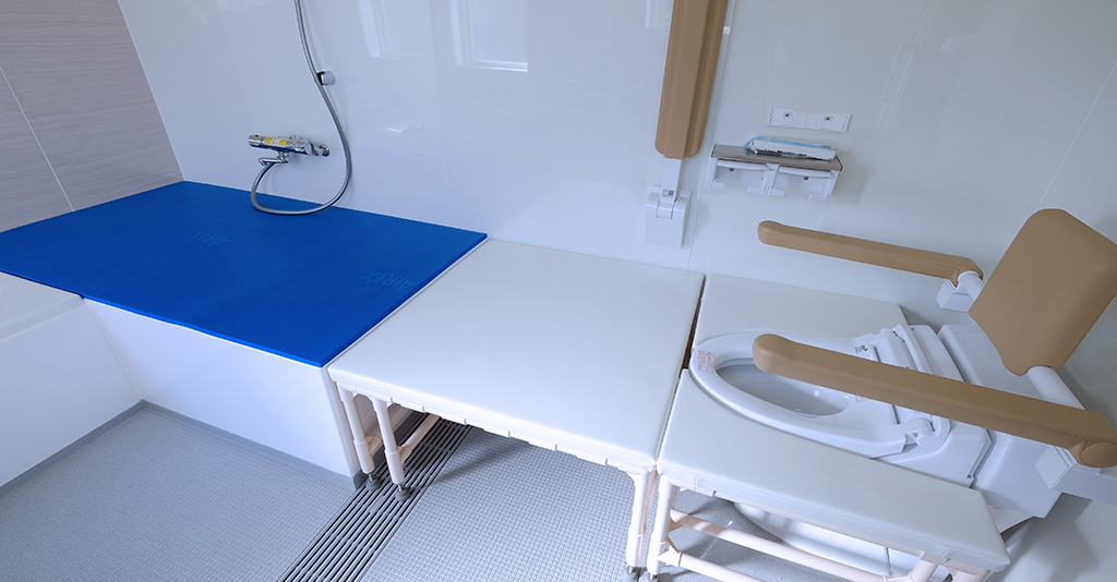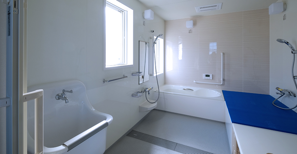 段差を無くしてフラットにする工夫移乗台に乗ってしまえば、あとは段差無しでの移動ができる。 施主様は事故で下半身不随とのことで、スムーズに浴室内を移動できるように「段差がないフラットな仕様」が求められました。 そんな想いを形にするオーダーメイドユニットバス介護ゆとりっくすを納品しました。