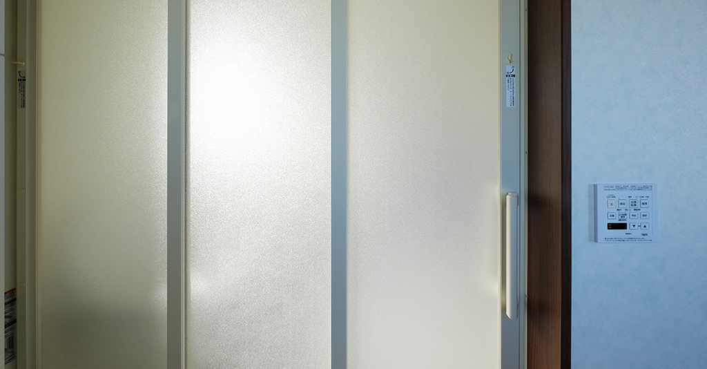 移乗台を使ってフラットに開口が広い三枚引き戸を開けると、約2メートル×3メートルという広い浴室空間。